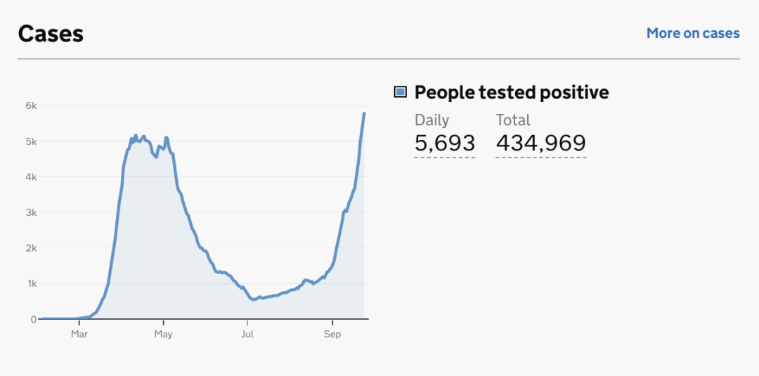 截止至2020年9月27日(周日)英国时间09:00,累计检测结果量19,583,360次(待更新);累计确诊434,969例(+5,693);累计病亡41,988例(+17)。