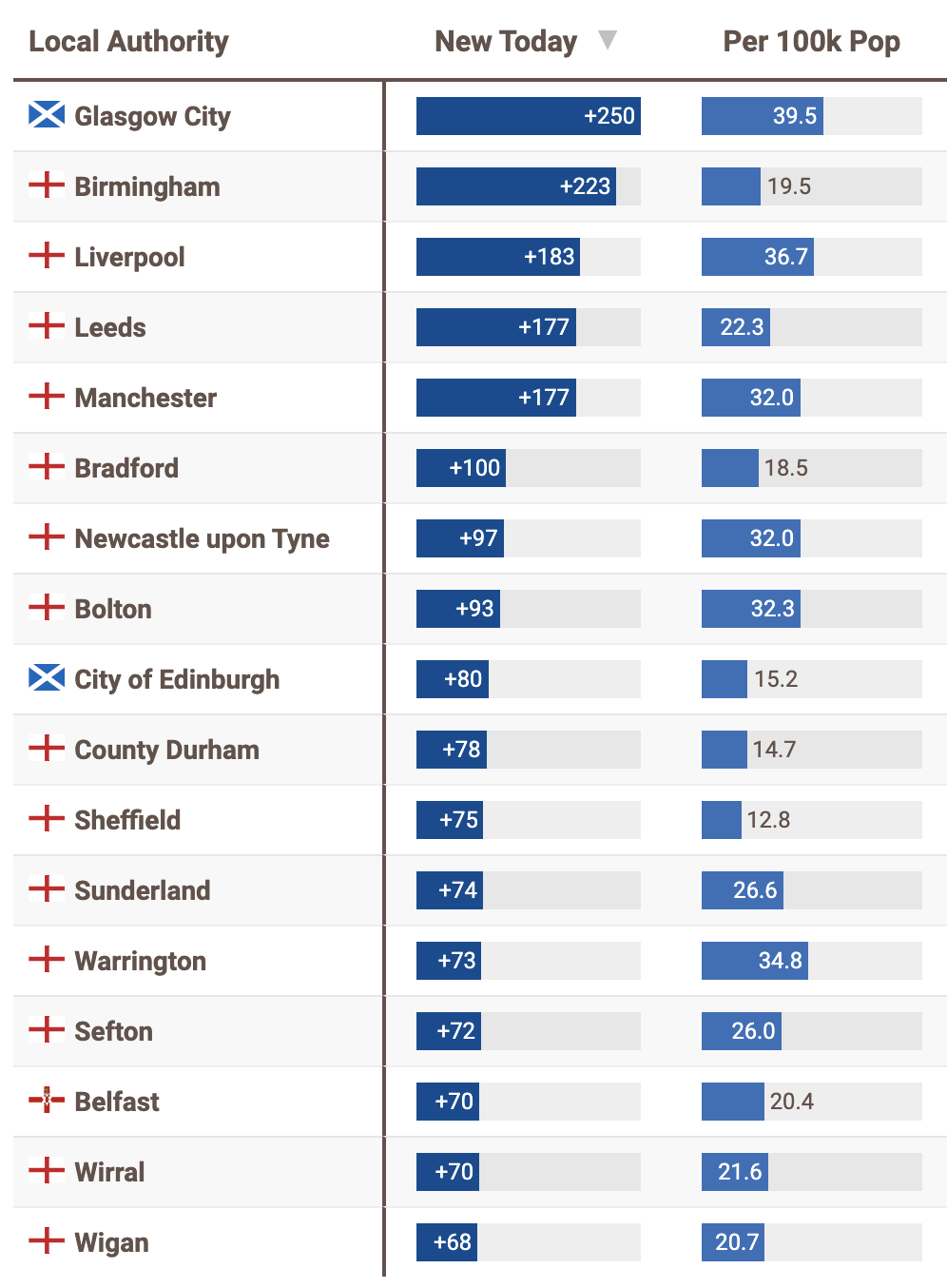 9月26日(周六),新增确诊数量最多的城市为格拉斯哥(+250)。苏格兰的疫情爆发,每日新增确诊都破记录,爱丁堡(+80)今日新增也排名第9。