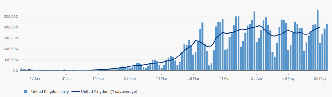 截止至2021年5月28日(周五)英国时间09:00,累计检测结果量177,486,846次(+959,007);累计确诊4,477,705例(+4,182);累计病亡127,768例(+10)。