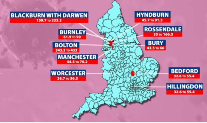 英格兰公共卫生局的数据显示,受该变种影响最严重的地区仍然是Bolton、Bedford和Blackburn with Darwen,它们分别出现了1354、366和361个病例。