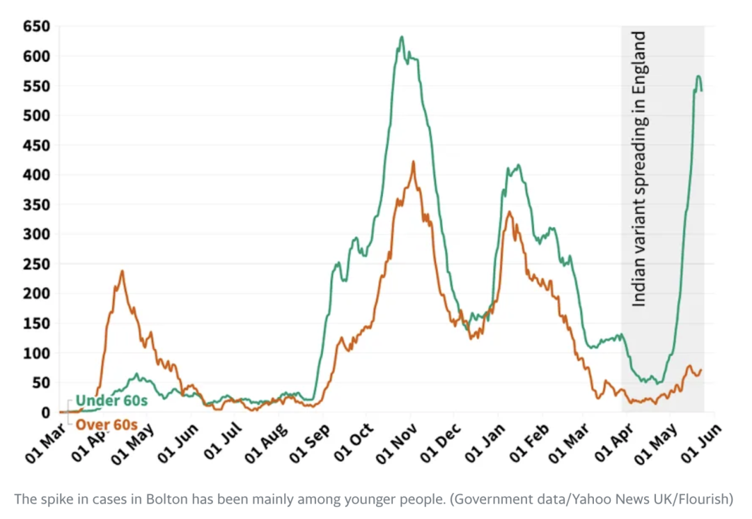 据悉,印度变种主要影响的人群是年轻人。在Bolton,绝大多数病例是60岁+群体。在其他城市中,60岁以下的新增确诊明显激增。