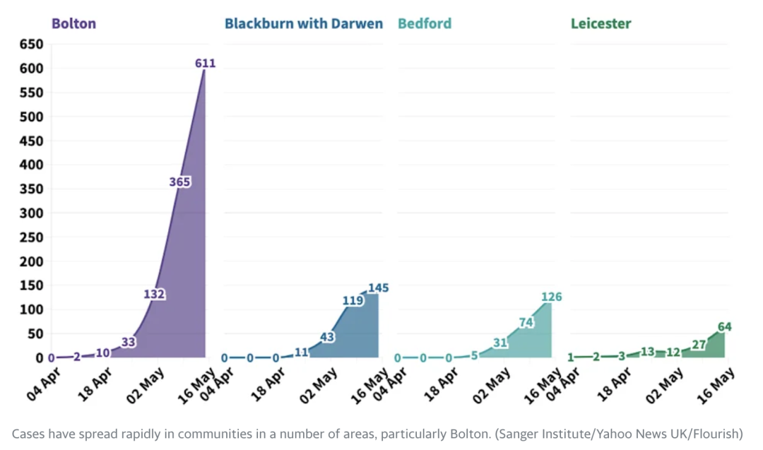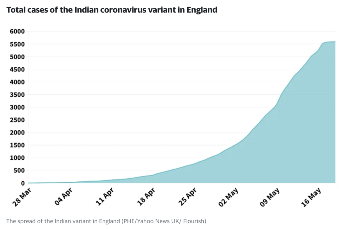 英格兰地区累计印度变种确诊 | 图片来源YahooNews!