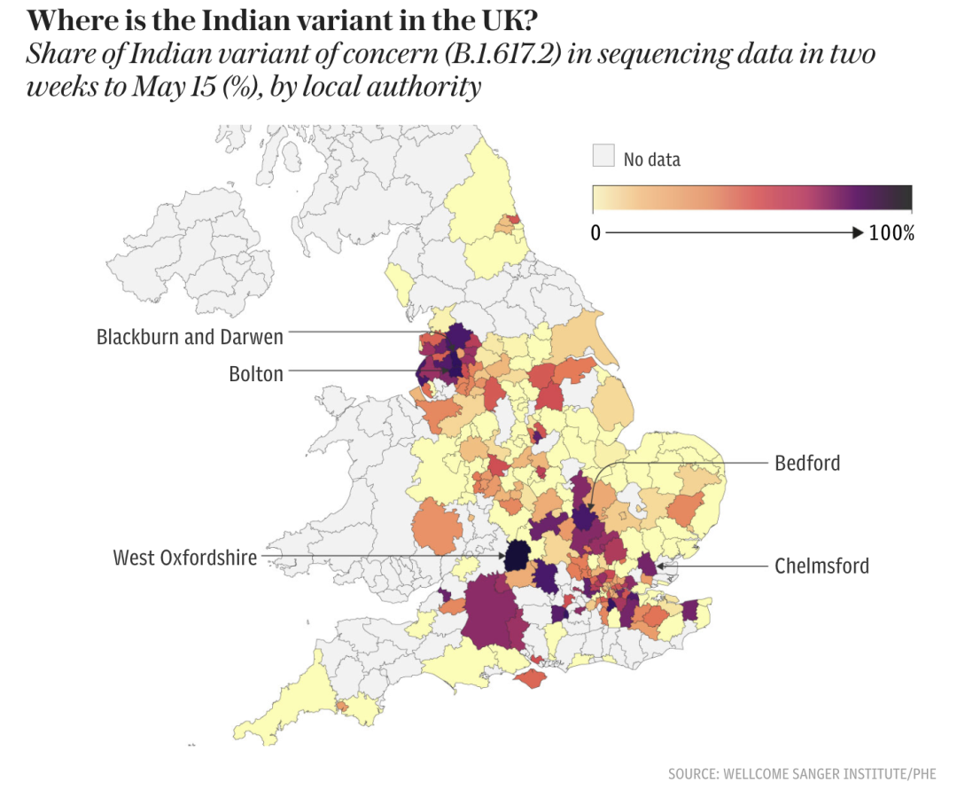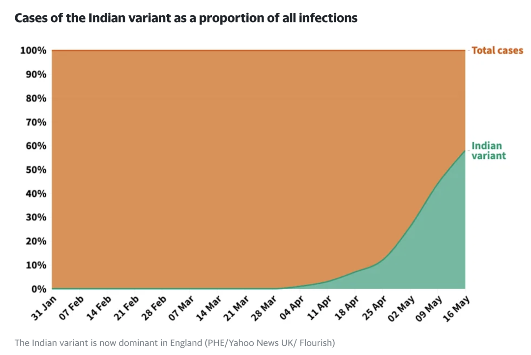 目前,首次在印度发现的B.1.617.2变种已经在英国各地占主导地位:占新感染确诊的3/4。
