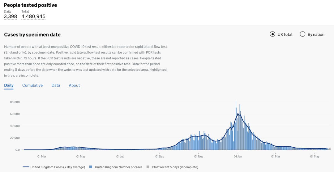 截止至2021年5月29日(周六)英国时间09:00,累计检测结果量177,486,846次(待更新);累计确诊4,480,945例(+3,398);累计病亡127,775例(+7)。
