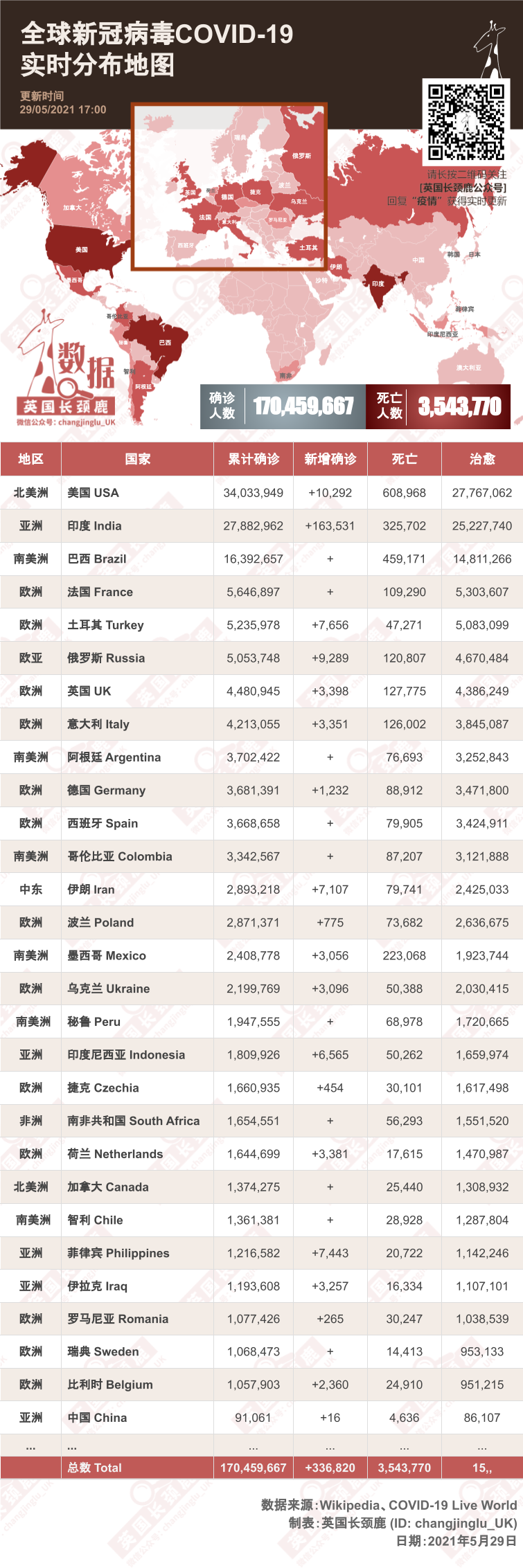 世界的累计确诊人数截止5月29日17:00超过1亿7,045万例(+500k),死亡超过354.3万例(+13k)。
