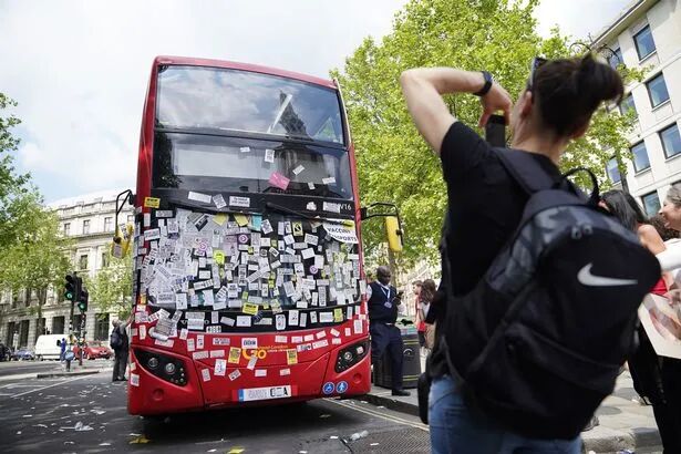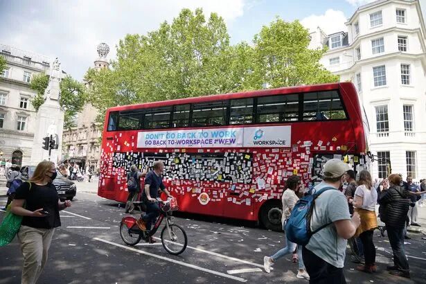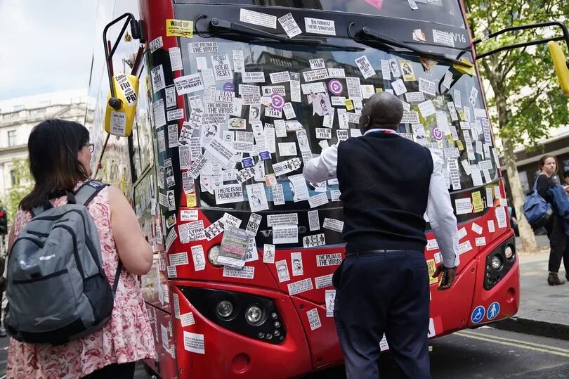 一辆伦敦双层红色巴士上贴满了反疫苗标签,包括“没有流行病”和“真理必胜”的标语。