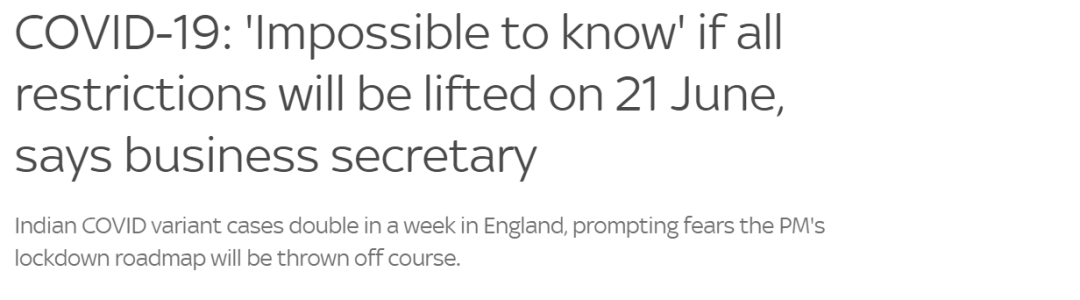 据Sky News报道,英国商务部长称目前"不可能"确定英格兰是否能够在6月21日取消所有新冠封锁政策。