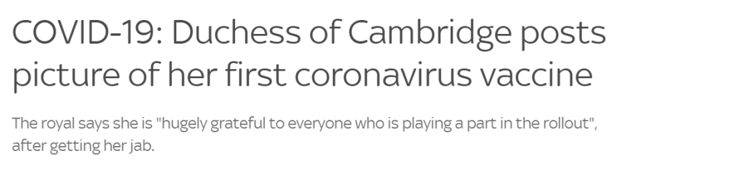 凯特王妃(剑桥公爵夫人)在其个人社交平台分享了一张自己接种新冠疫苗的照片。