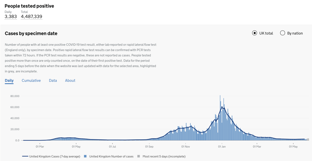 截止至2021年5月31日(周一)英国时间09:00,累计检测结果量177,486,846次(待更新);累计确诊4,487,339例(+3,383);累计病亡127,782例(+1)。