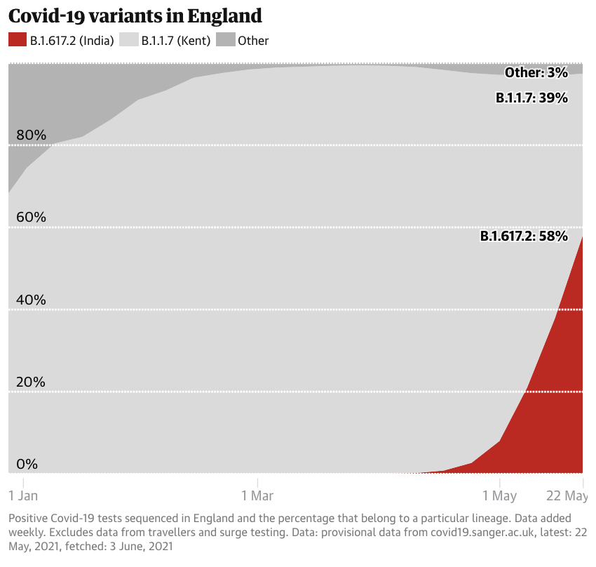英格兰公共卫生局说,印度变种现在在整个英国占主导地位:在最新的每周数据中,新增5,472个印度变种病例,使该变种的累积确诊达到12,431例。