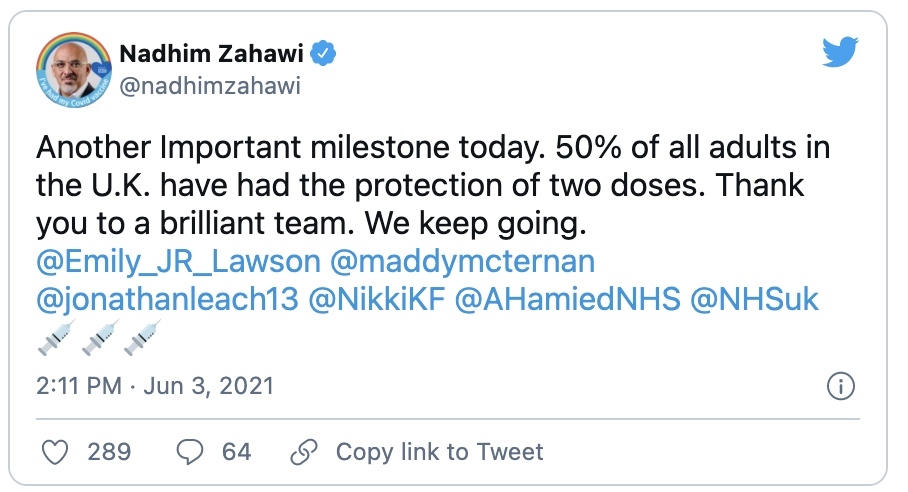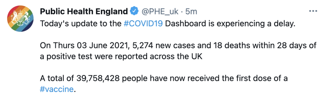 英国全境截至今日,已接种第1剂疫苗共39,758,428人(+172,763);已接种第2剂疫苗共26,073,284人(待更新)。