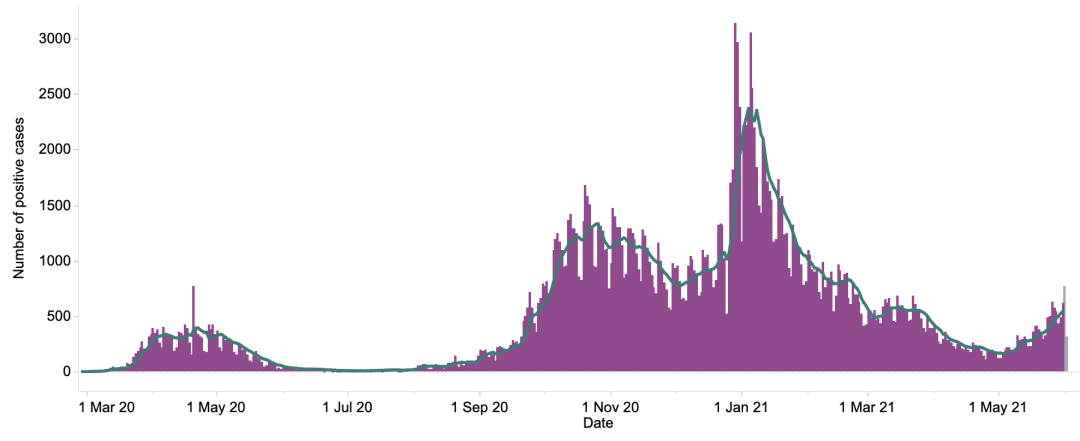 根据最新的检测追踪数据显示,在截至5月26日的一周内,全国共有17,162人至少一次检测呈阳性——这比前一周增加了1/5以上,也是自4月14日开始的一周以来检测呈阳性的最高人数。