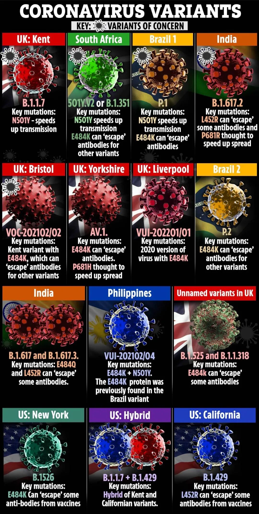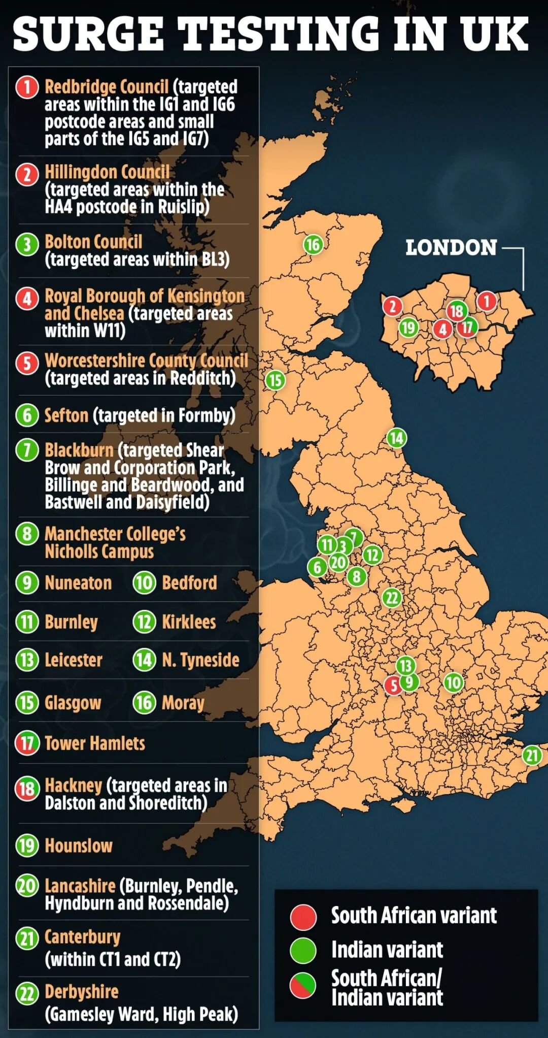 英国各地开始大量检测变种:红-南非变种/绿-印度变种
