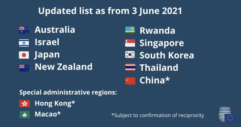 除原本的澳大利亚、新加坡等7国外,该名单上新增日本和中国,但中国(包括中国香港和中国澳门)需满足“确认互惠*”。英国和美国并未在其中。