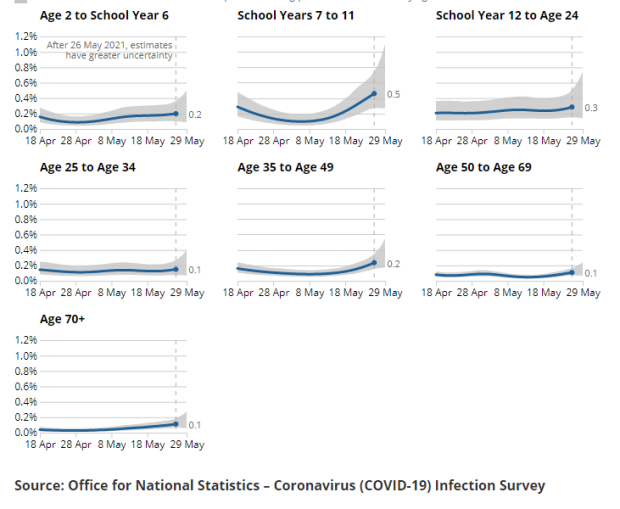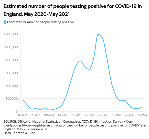 国家统计局(ONS)估计,在截至5月29日的一周内,全国有85,600人感染了新冠,相当于私人家庭每640人中就有1人确诊。