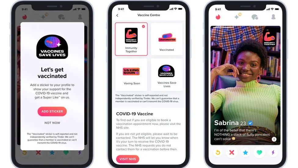 据悉,现在英国的线上交友软件纷纷在用户个人资料页面上植入了一个徽章,用来显示他们是否已经接种了新冠疫苗或支持接种疫苗。但是,交友软件无法核实那些显示徽章的人是否真的接种过疫苗。