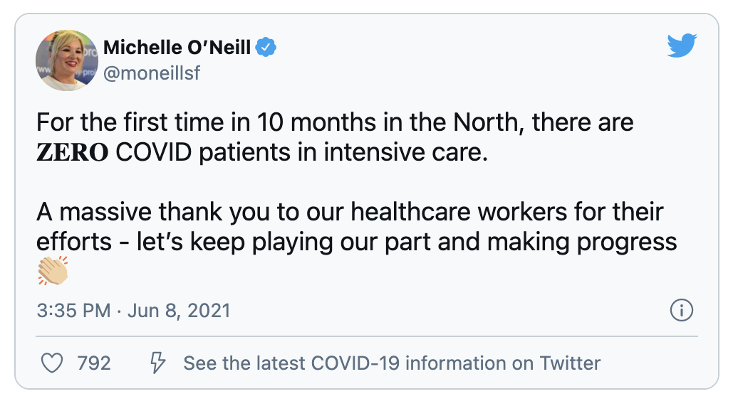 北爱尔兰地区的副首席部长Michelle O'Neill今日还公布:北爱地区10个月来首次将重症监护室中的新冠患者人数降为零。她呼吁人们向医疗工作者致敬,表示感谢。