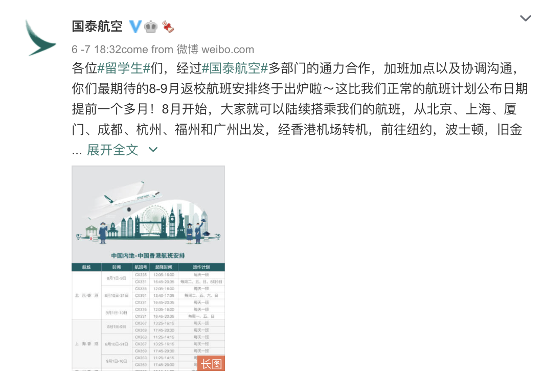 国泰官方表示:经过多部门通力合作以及协调沟通,8-9月返校航班安排终于出炉啦——这比正常的航班计划公布日期提前一个多月!