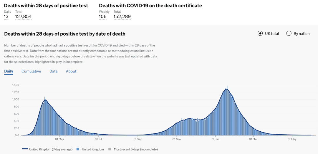 该数据不仅揭示了自1月以来新冠死亡人数的稳步下降,社会新冠限制以及疫苗大规模顺利推广的综合影响更是继续推动了死亡数据的持续降低。