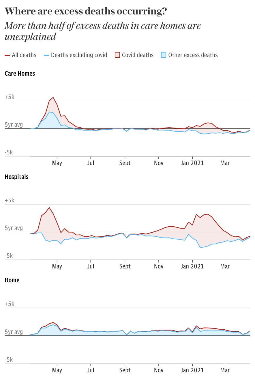 此外,在第一波疫情死亡人数最严重的老人院中,截至5月28日的一周内,英格兰和威尔士约有12名老人院居民的去世于新冠有关——该数据比前一周下降了52%,更是自疫情开始以来单周登记老人院居民死亡人数最低的一次。