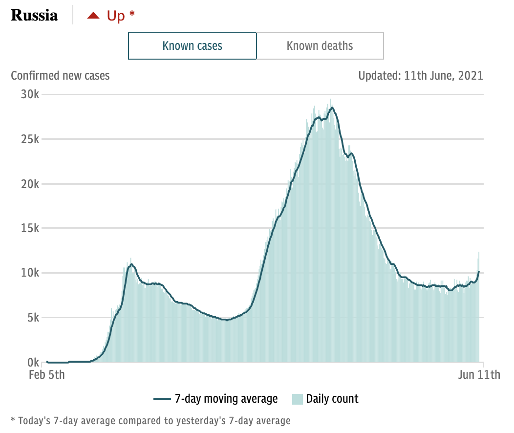 过去24小时内,俄罗斯报告了13,510例新增确诊,使累计确诊达到几乎520万例——这已经是当地第五天新增确诊数据急剧上升了,也使每日感染人数突破了三个月内的新高。