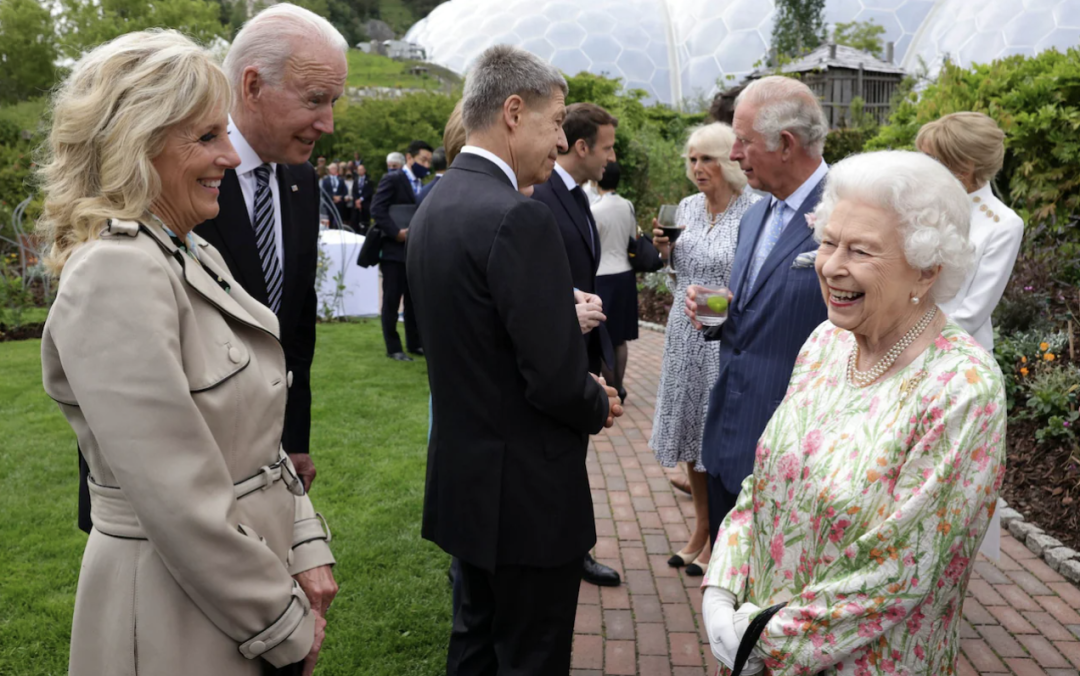 首先,女王与查尔斯王子、威廉王子一起参加了在康沃尔的伊甸园项目举行的记者招待会——该项目是一个环境教育中心,距离Carbis Bay的峰会会场约56英里距离。随后,女王在一个不对媒体开放的私密晚宴上接待了七国集团领导人及其配偶们。