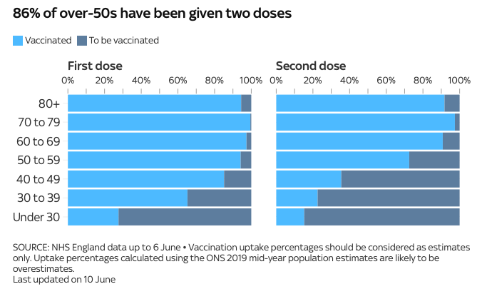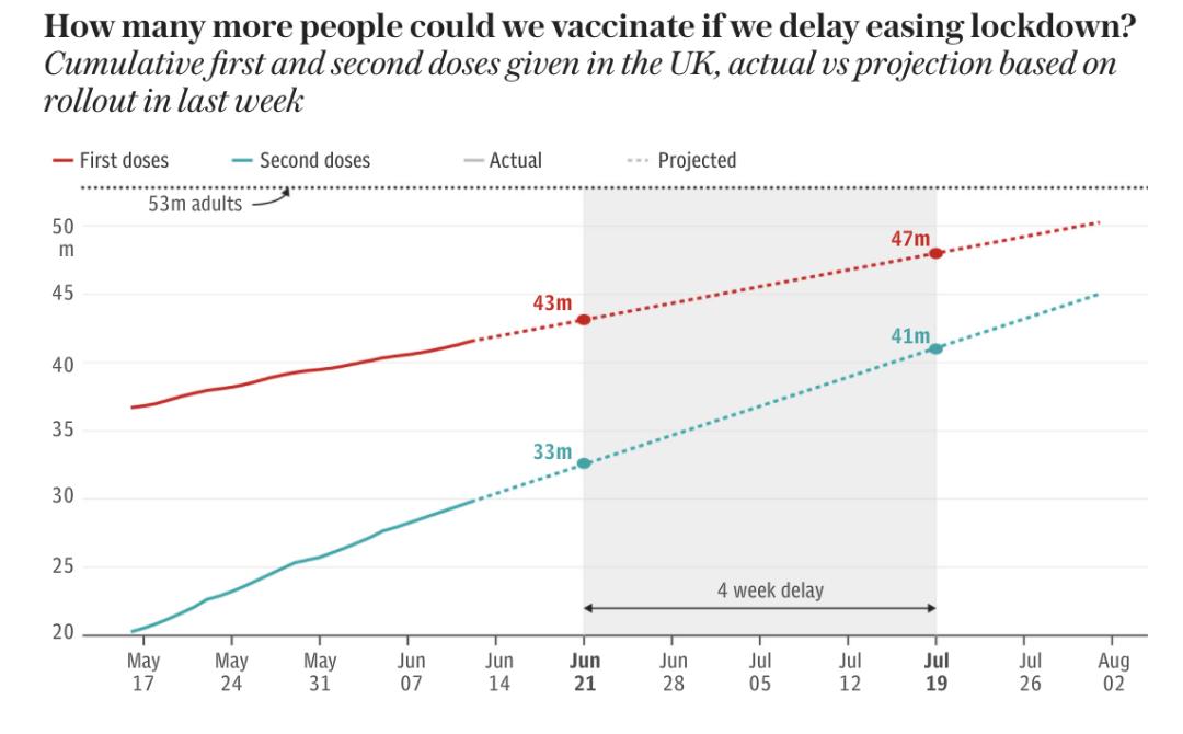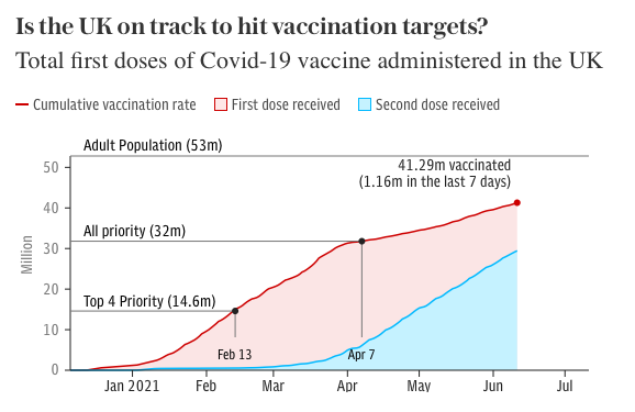 - 完全所有成年人接种完首剂疫苗的目标已经从7月底提前至7月19日:这意味着所有成年人都应在新的解封日期时接种至少一剂疫苗。