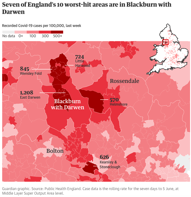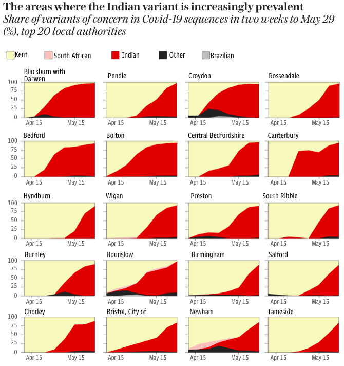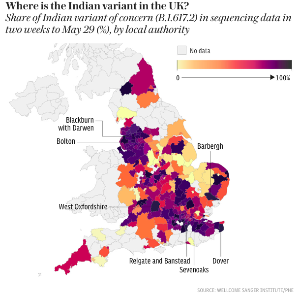 数据显示,在英格兰西北部的博尔顿(Bolton)和布莱克本与达文(Blackburn with Darwen)地区,印度变种感染率仍然最高,这两个地方当局已经部署了额外的疫苗接种。