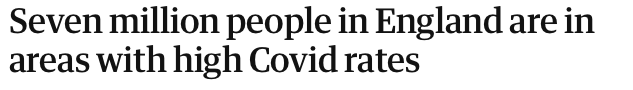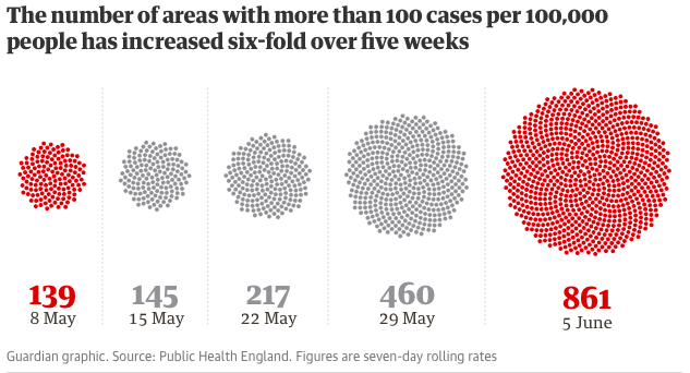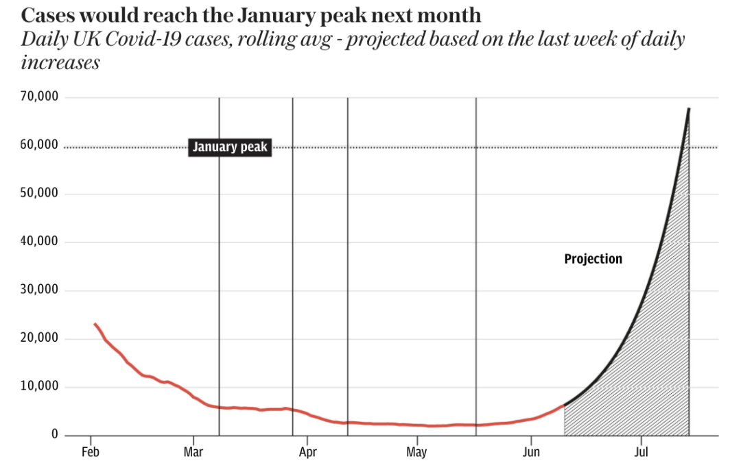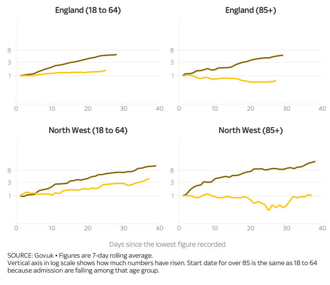 该数据在某种程度上“令人担忧”——英国各地的病例数量正在急剧上升,几乎“每9天翻一番”。尽管没有去年9月份增长迅速,但同样是稳定的指数式增长。