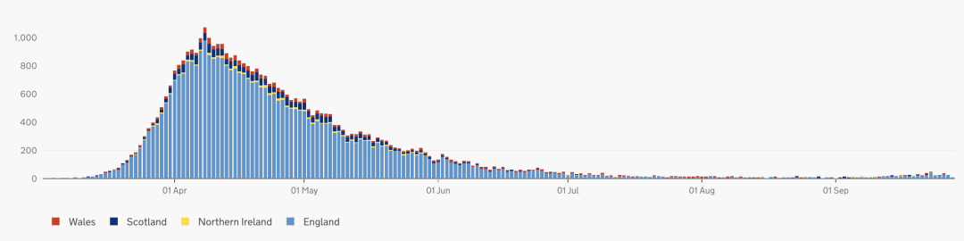 截止至2020年9月29日(周二)英国时间09:00,累计检测结果量20,503,188次(+198,402);累计确诊446,156例(+7,143);累计病亡42,072例(+71)。