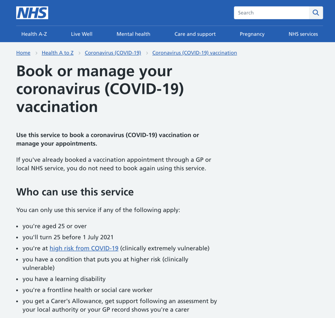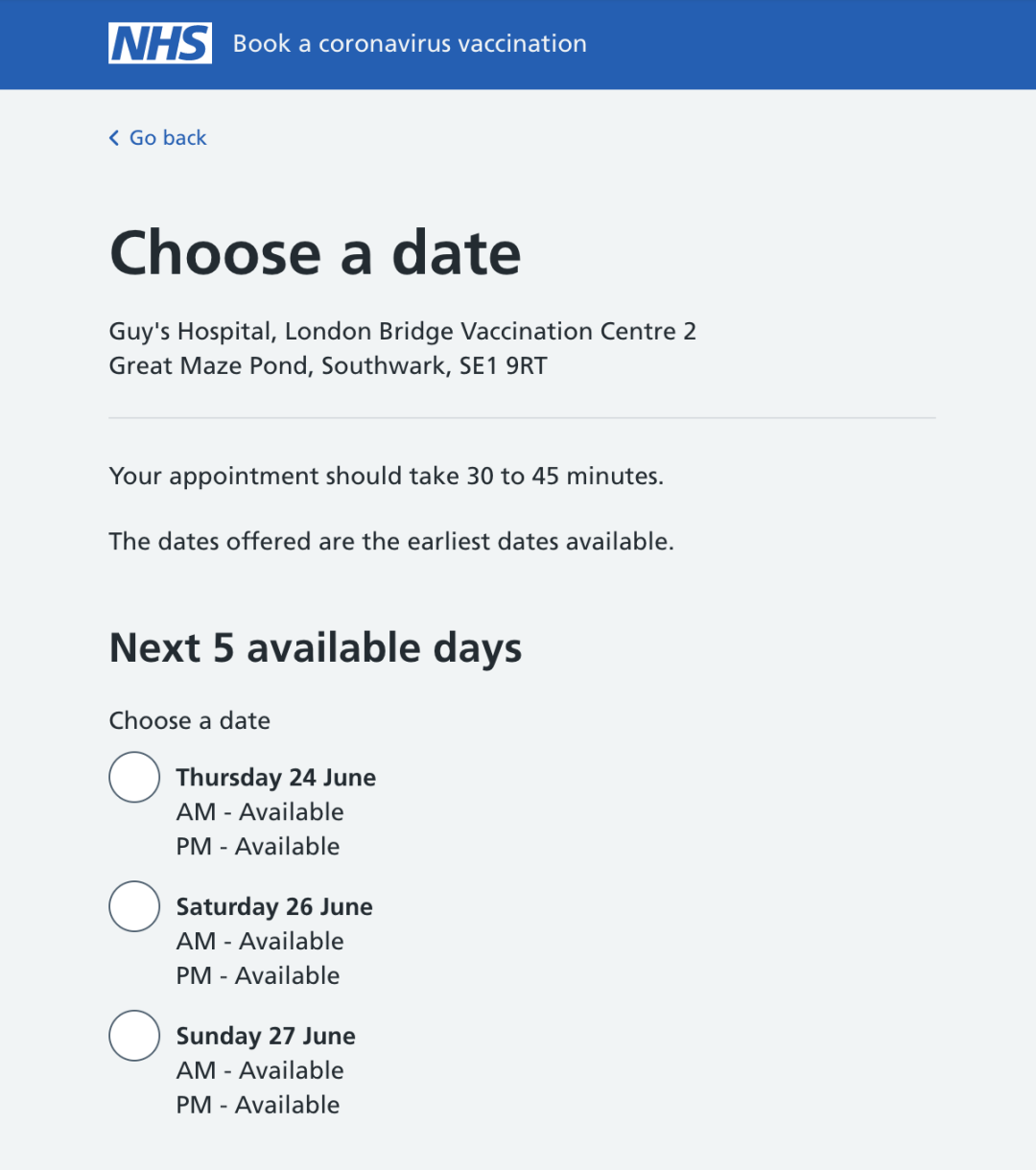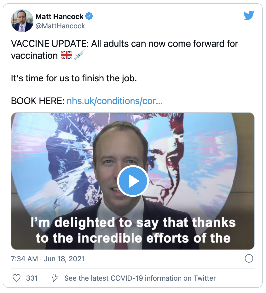 6月18日(周五),英格兰地区正式开始向18岁以上所有成年人开放疫苗接种预约服务。