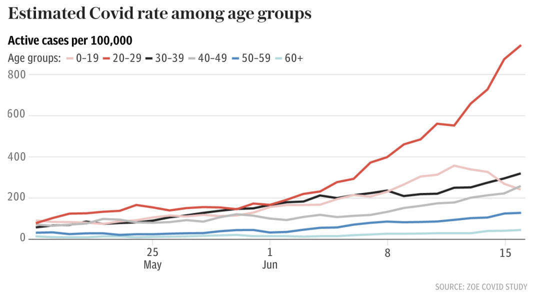 国王学院ZOE症状追踪app的最新数据显示,截至6月12日,未接种疫苗者的病例仅增加了28%,而前一周则增加了114%;此外,在完全和部分接种疫苗的群体中,感染率的增长从89%下降到53%。