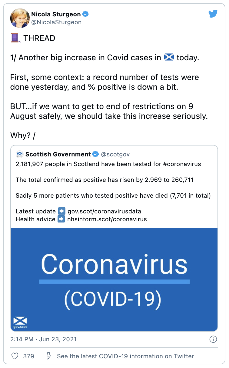 苏格兰第一大臣还补充道,如果希望新冠限制按计划在8月9日结束,那么所有苏格兰的人应该认真严肃对待这一增长。