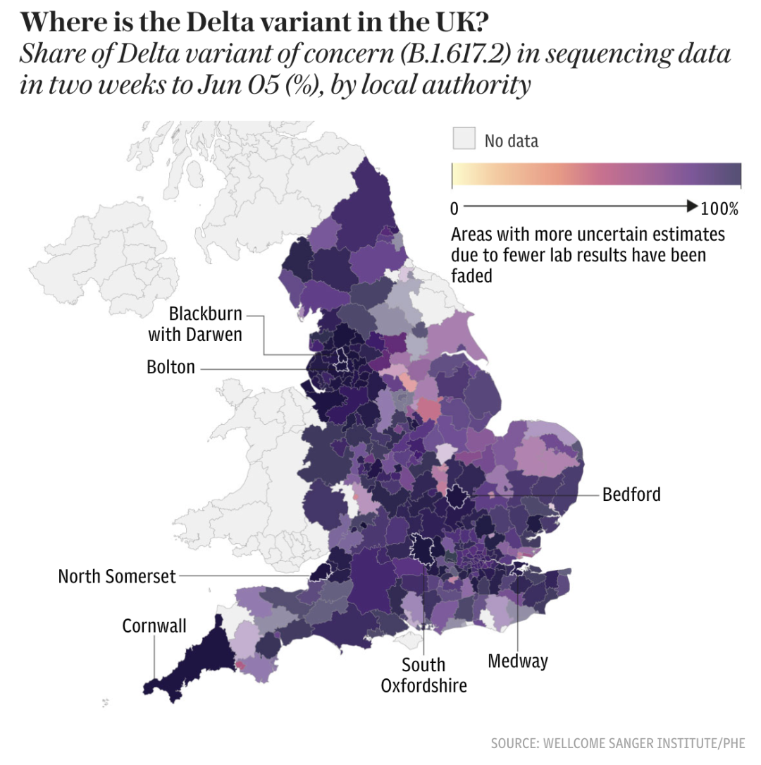 目前英国各地印度delta变种占新增确诊的比例