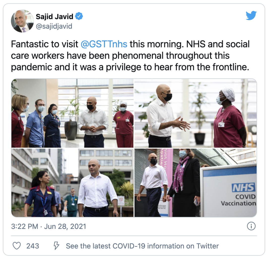 今日,他还首次作为英国卫生部部长探访了NHS医院以及疫苗接种中心的工作人员。