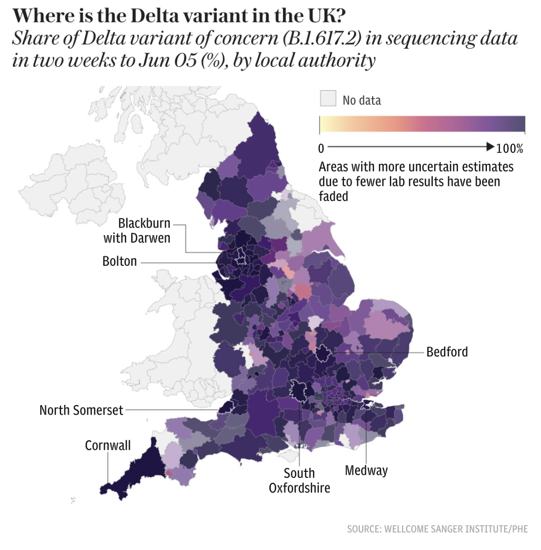 疫苗方面——总的来说,84.9%的英国成年人现已接种首剂疫苗;62.4%的人已经完全接种了两剂疫苗。