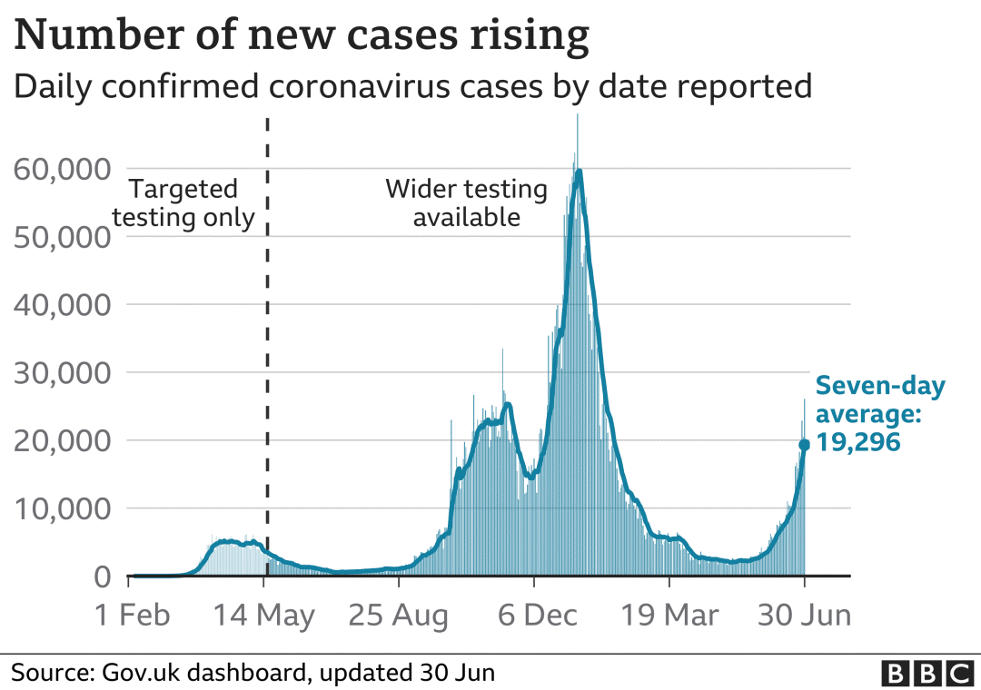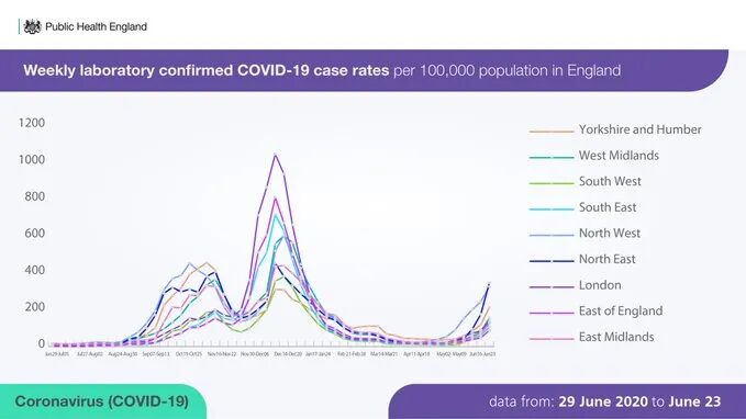来自NHS测试和追踪的数据显示,在截至6月23日的一周内,共有79,248人检测呈阳性,比前一周增长了43%。同一星期有10,289人在政府管理的检疫酒店中进行隔离,这是自2月开始实施检疫制度以来的最高数字。