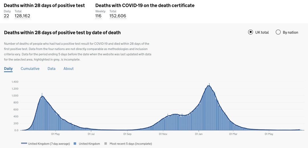 死亡病例数仍保持在较低水平 | 图片来源Gov.uk