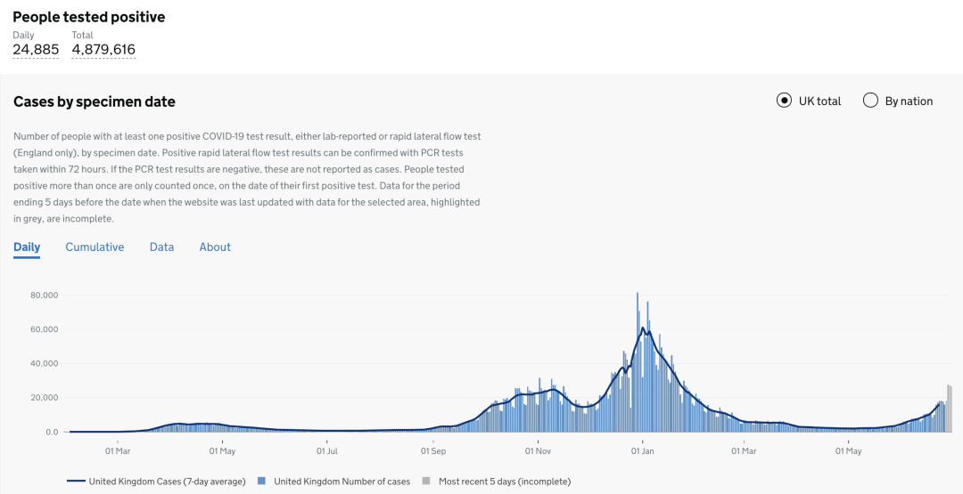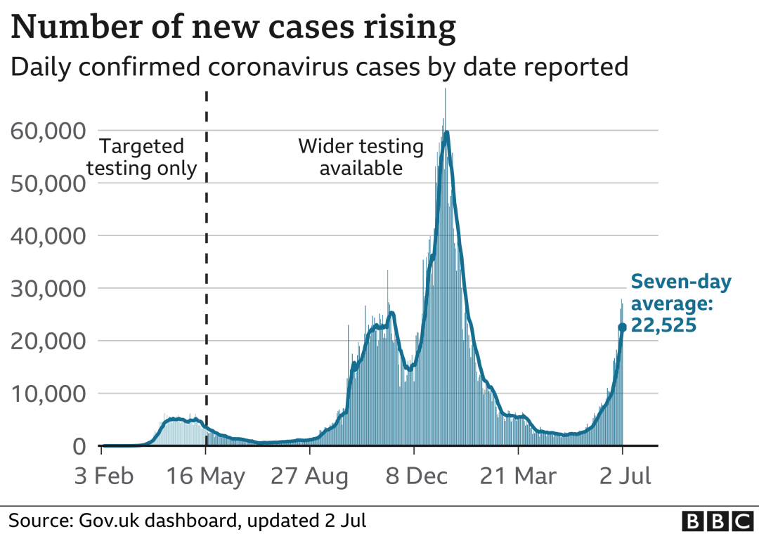 目前,尽管英国疫情有很明显的回升,第三波疫情已经到来,但卫生部部长Sajid Javid以及首相鲍里斯依旧坚持7月19日的全面解封,并很有可能在解封后取消所有形式的社会限制。