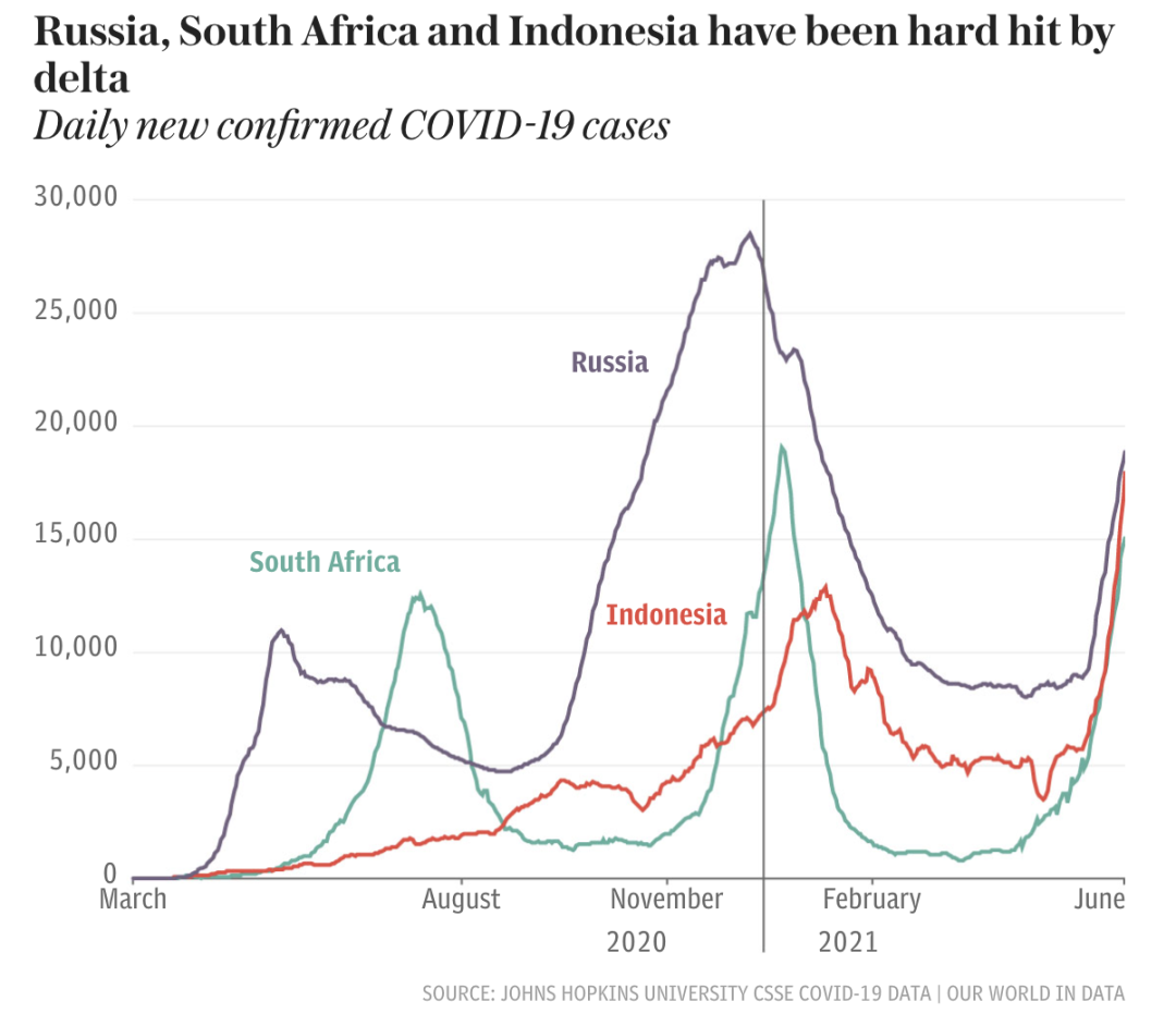 目前世界疫情处在急速上升期的分别是俄罗斯、印度尼西亚以及南非共和国。