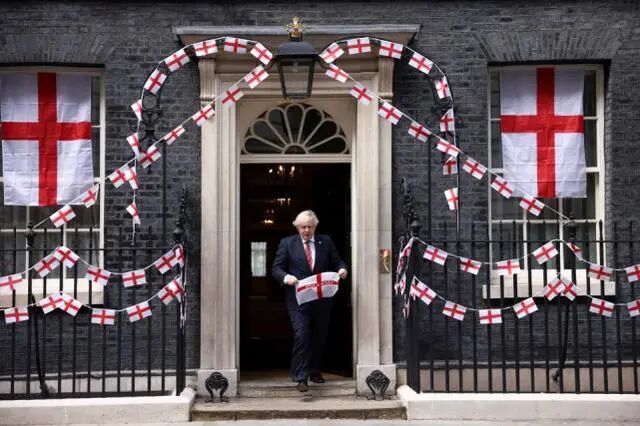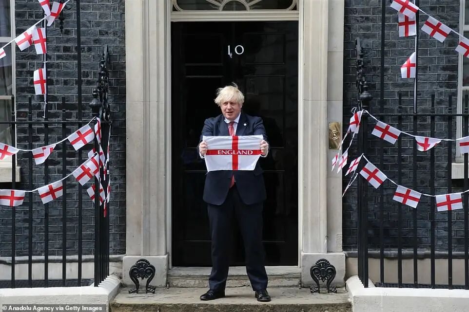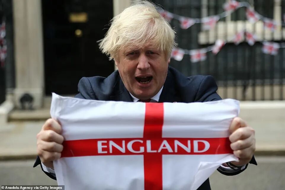鲍里斯在自己的西装外套上佩戴了英格兰徽章,站在首相府外挥舞着旗帜,与镜头互动——他对着镜头竖起大拇指,与全英格兰的球迷一起,迎来这场盛大的赛事。