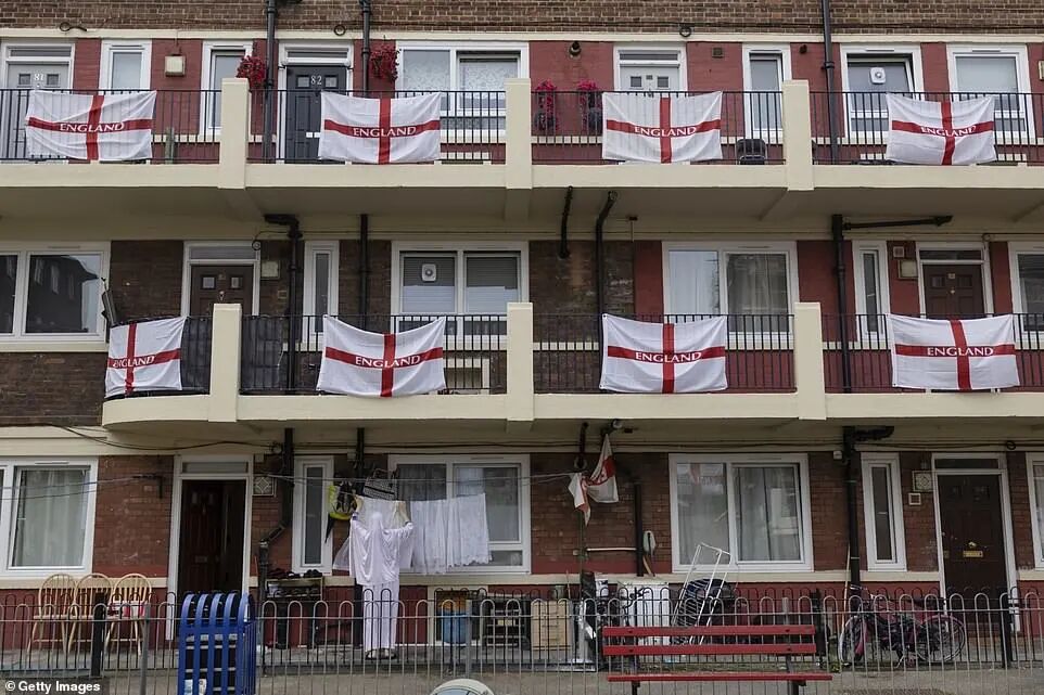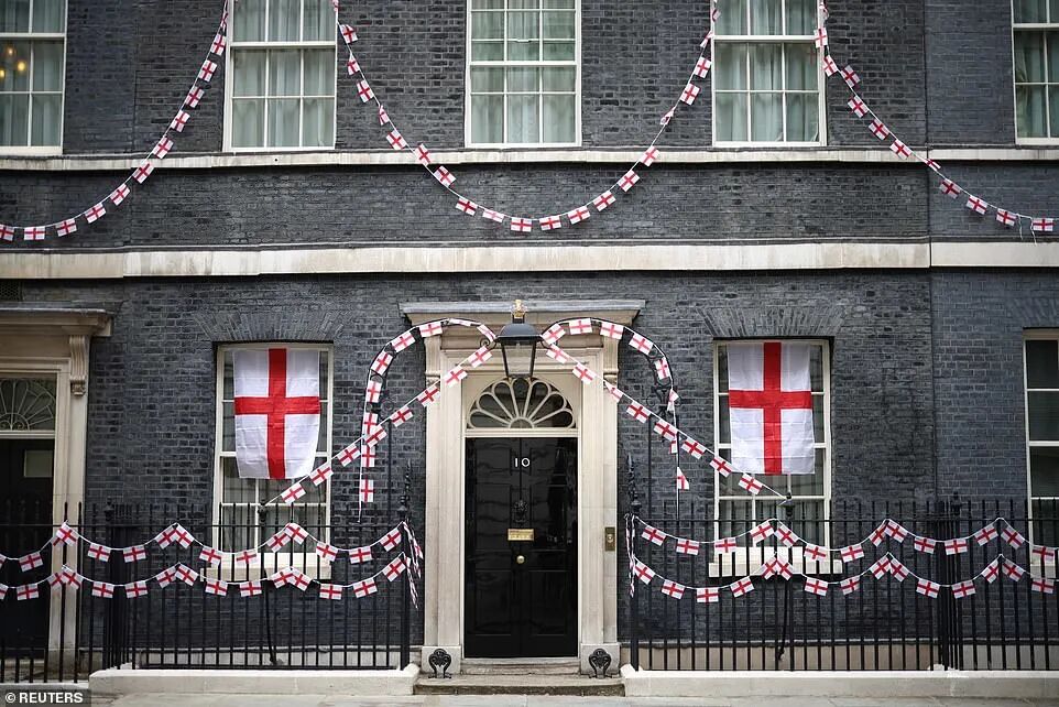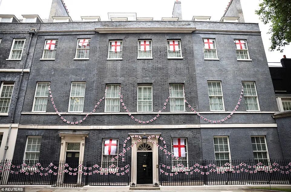 在周日(7月11日)英格兰对阵意大利的2020年欧洲杯决赛之前,英格兰圣乔治旗挂满了整个唐宁10号。在官邸外的窗户、灯柱和大门上悬挂了数十面旗帜。