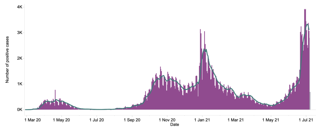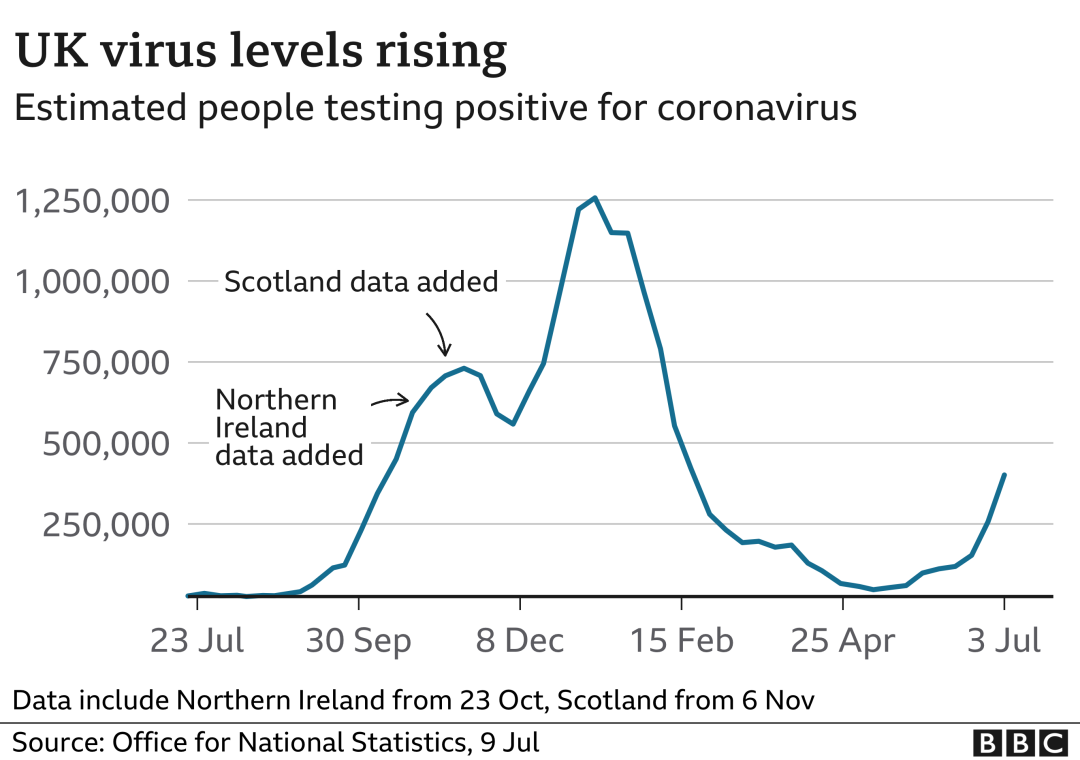 社区拭子检测的最新数据表明,每160人中就有1人感染了新冠病毒。在英格兰,这是自2月中旬以来的最高水平。而传染性更强的印度Delta变体现在占到了该国99%的病例。