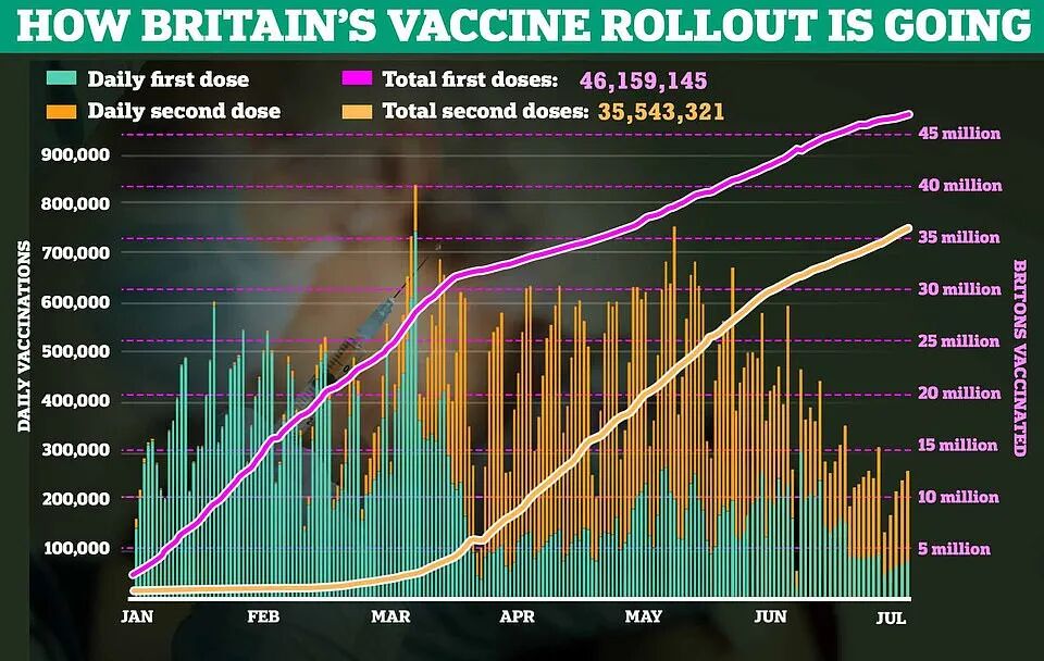 英国全境截至今日,已接种第1剂疫苗共46,227,101(+67,956);已接种第2剂疫苗共35,732,297人(+188,967)。