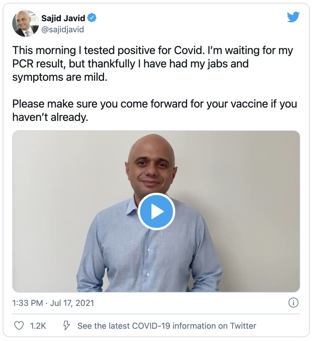 7月17日(周六),英国新上任的卫生部长Sajid Javid发布讯息宣布:自己的新冠检测呈阳性,目前正在等待PCR检测结果,同时与家人在家中自我隔离。