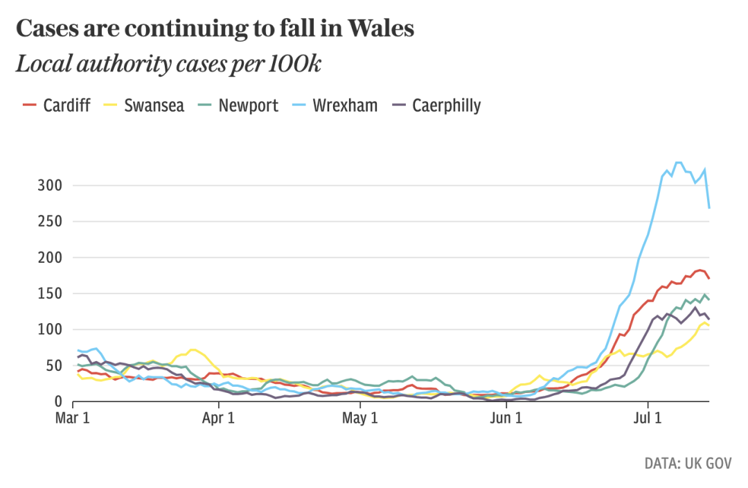 他还确定:如果威尔士新冠感染率保持稳定,更多的人接种了疫苗,那么官方计划在8月7日进入「Alert Zero Level 新冠零级警备状态」,这意味着几乎所有的限制都将被取消——所有场所将能够开放;对于可以在室内与他人见面的人数也不会有法律限制。