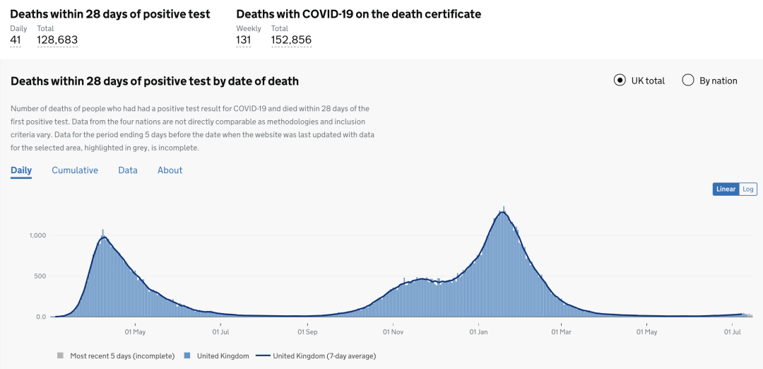 截止至2021年7月17日(周六)英国时间09:00,累计检测结果量226,084,936次(待更新);累计确诊5,386,340例(+54,674);累计病亡128,683(+41)。