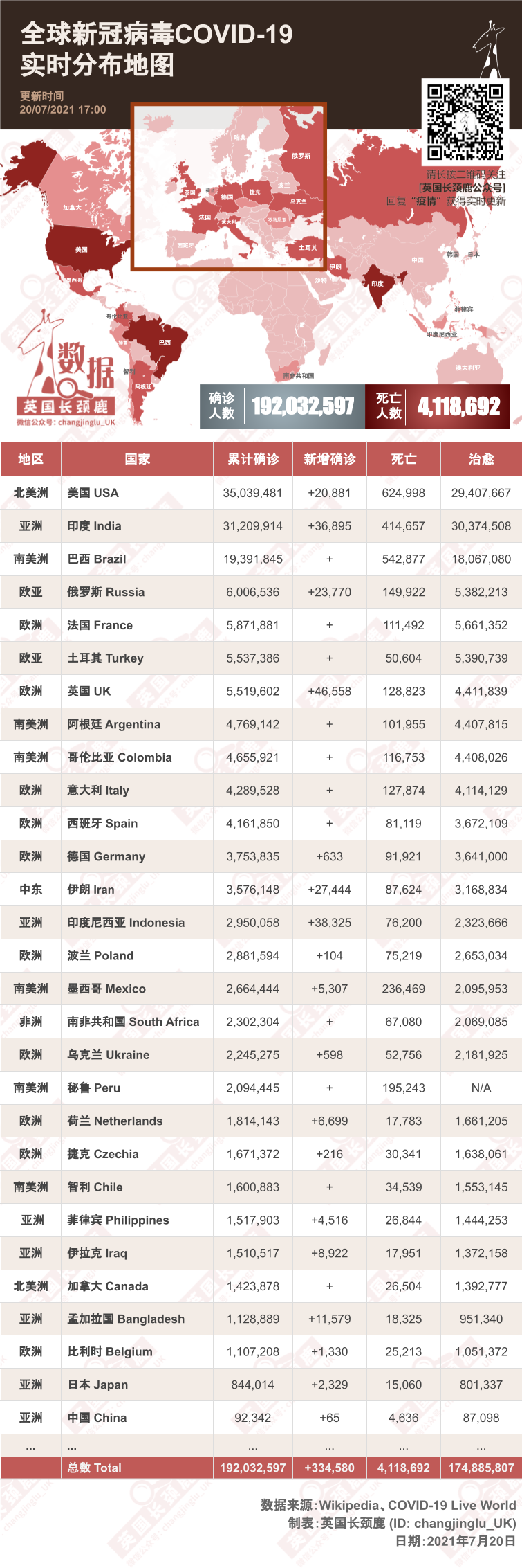 世界的累计确诊人数截止7月20日17:00超过1亿9,203万例(+500k),死亡超过411.8万例(+6k)。