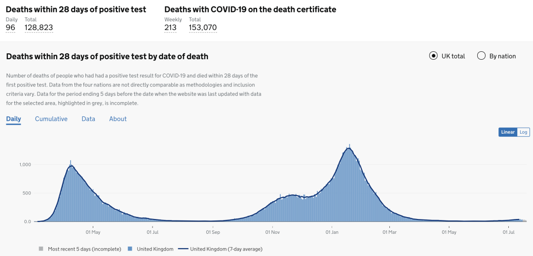 截止至2021年7月20日(周二)英国时间09:00,累计检测结果量230,272,717次(+1,074,493);累计确诊5,519,602例(+46,558);累计病亡128,823(+96)。