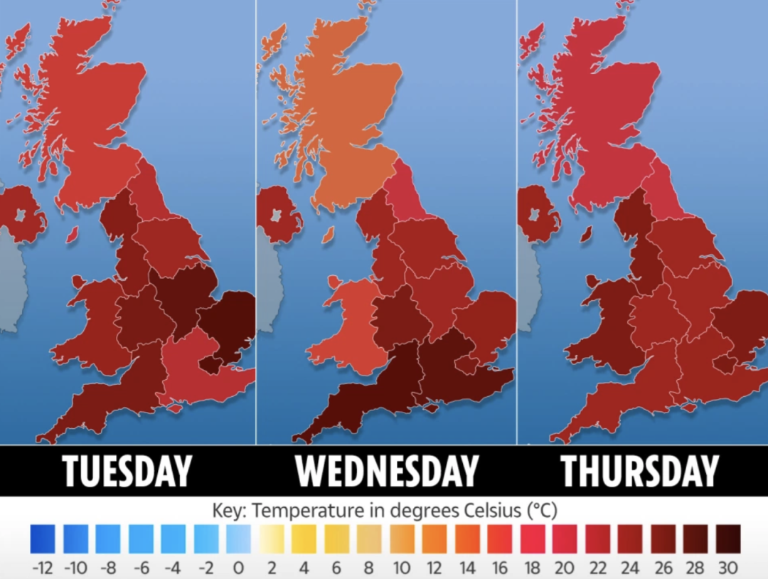 气象局的Steven Ramsdale透露:高温将持续到本周周末,白天温度会保持在25-30+摄氏度之间,同时夜间温度也很高。